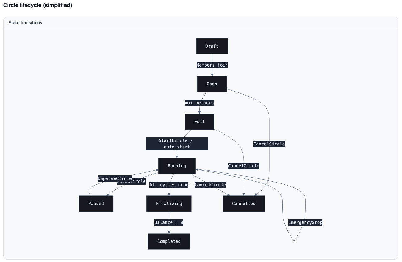 Minimal, auditable contracts. The core circle contract is intentionally small. Fewer lines of code means fewer places for bugs to hide.