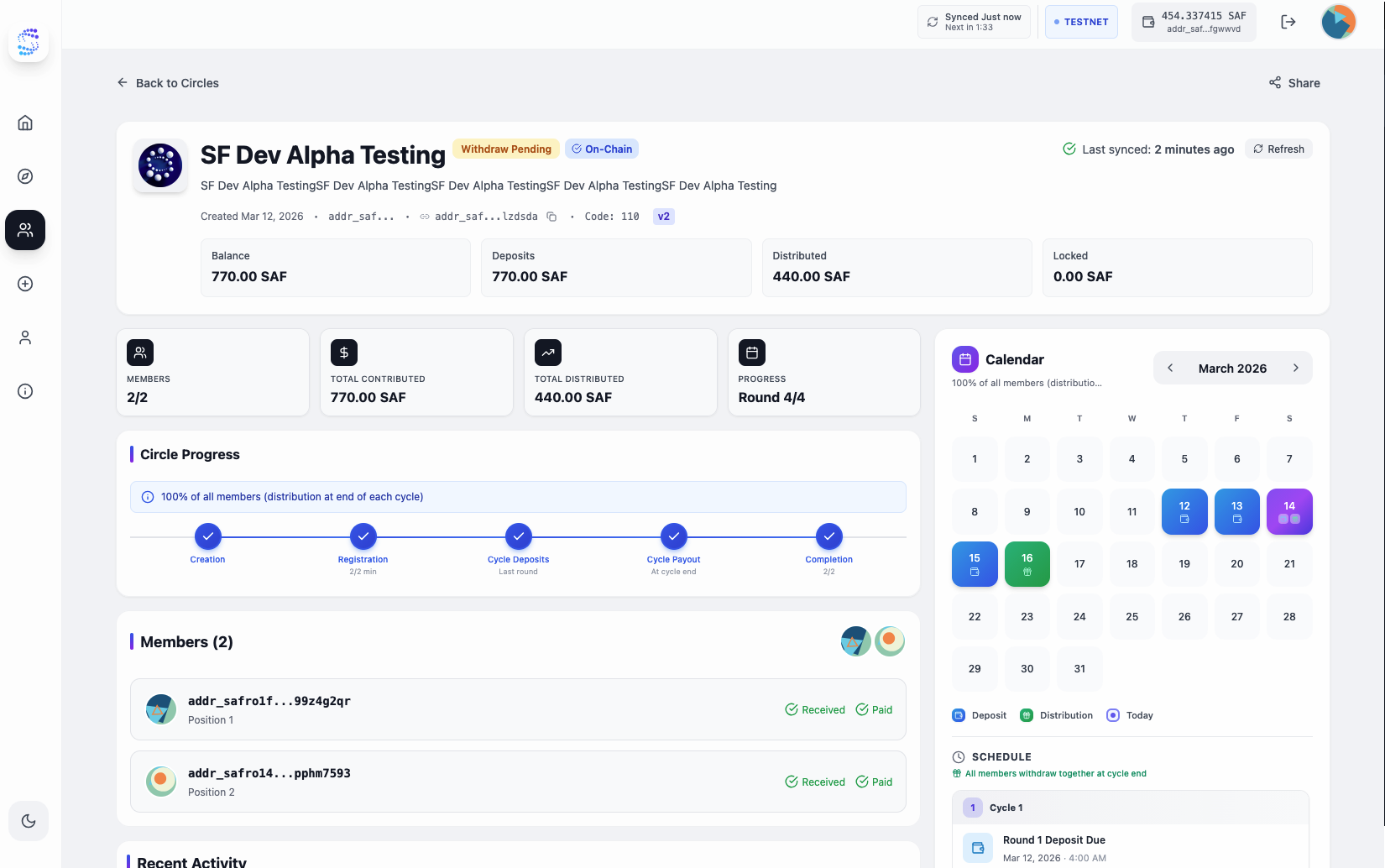 On-chain credit history. Completing circles generates a verifiable, portable record of contribution reliability that other Safrochain protocols can use to offer credit, without exposing a user’s personal identity.
